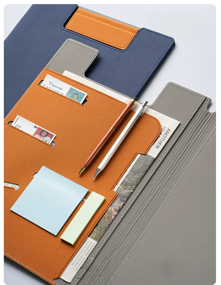 Various inside pockets and slots capable of holding business cards, ID cards, documents, and a pen, which facilitates daily use and business travels.