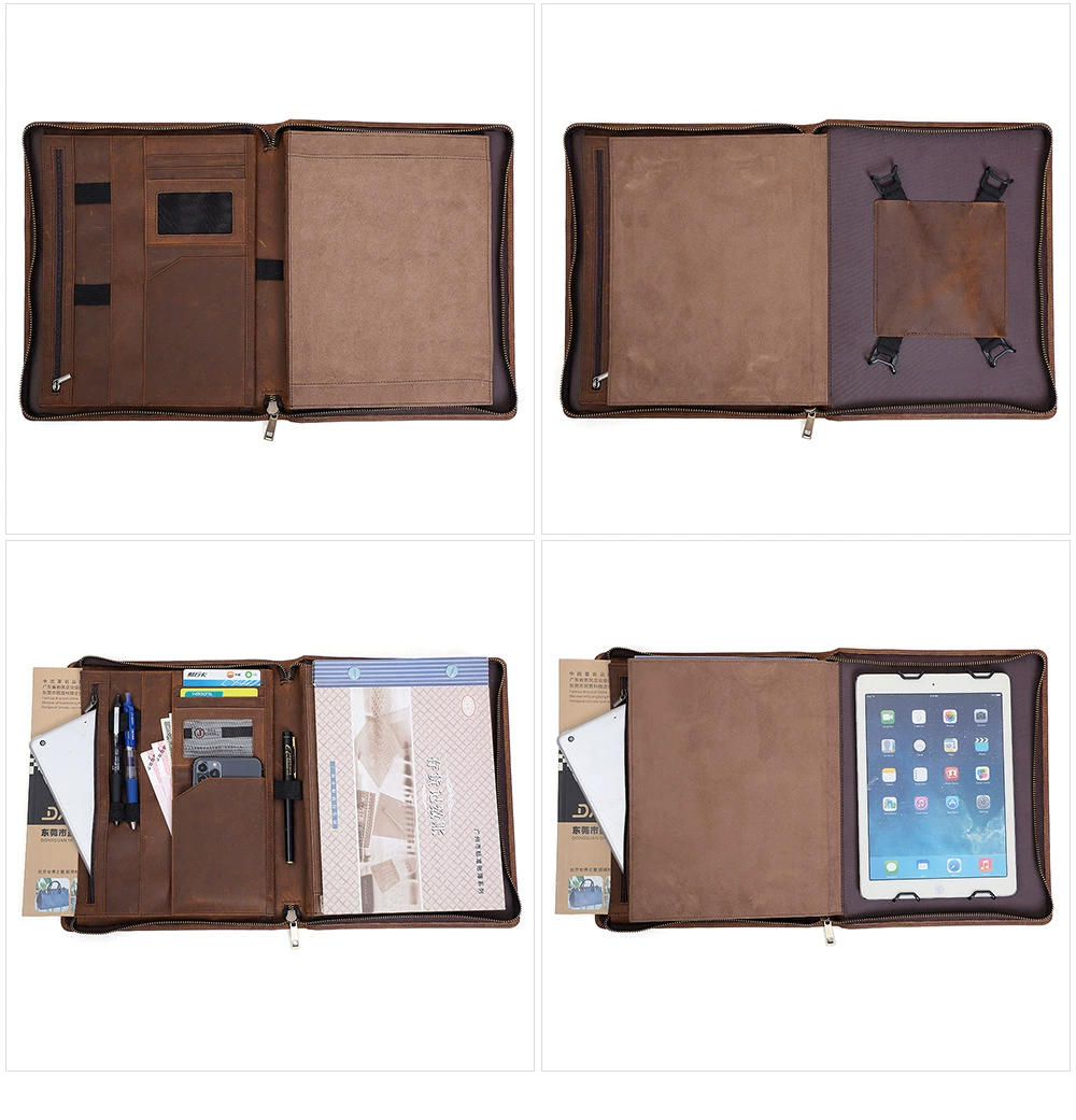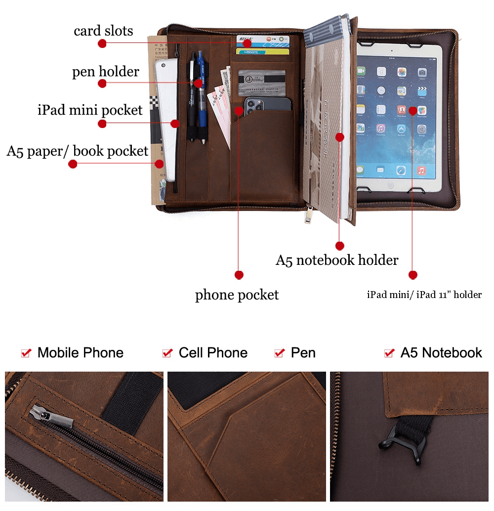 - √ Versatility: 3 card slots for storage; 1 smartphone pocket; 1 side pocket for notebook; notepad holder for Top-open letter size notepad / writhing pad; 1 ipad holder (fits for iPad 11"/ iPad mini); 2 expandable pen band; 1 zippered pocket for receipts and meeting notes; 1 cash pocket; 1 external zipper pouch