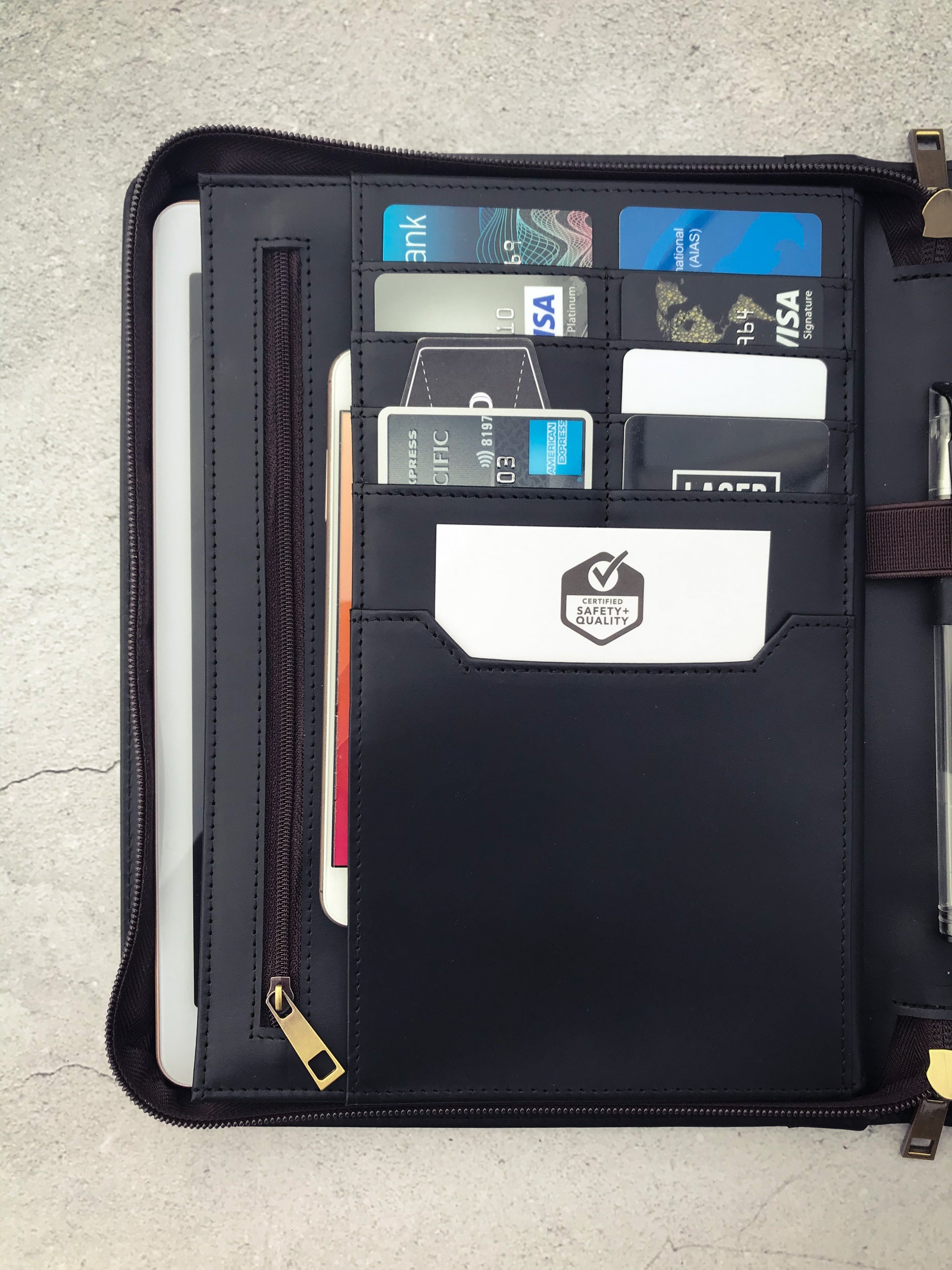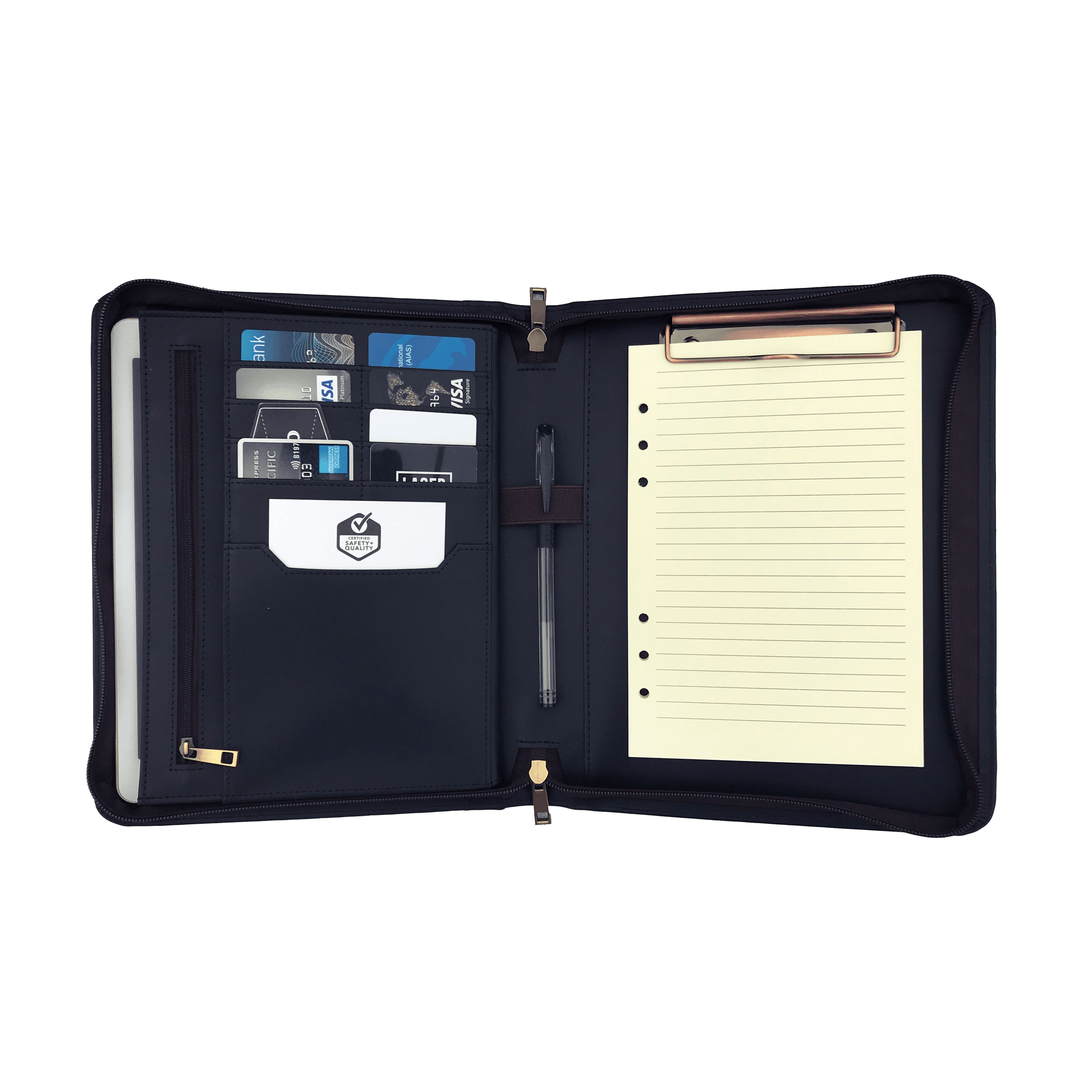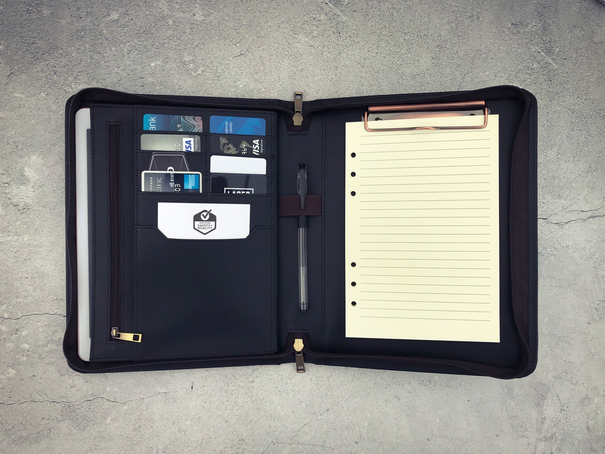 - √ Versatility: 8 card slots for storage; 2-in thick pocket can store up to 100 sheets of paper; notepad clipboard for Top-open letter size notepad / writhing pad; 1 expandable pen band; 1 zippered pocket for receipts and meeting notes; 1 external pouch with fastener