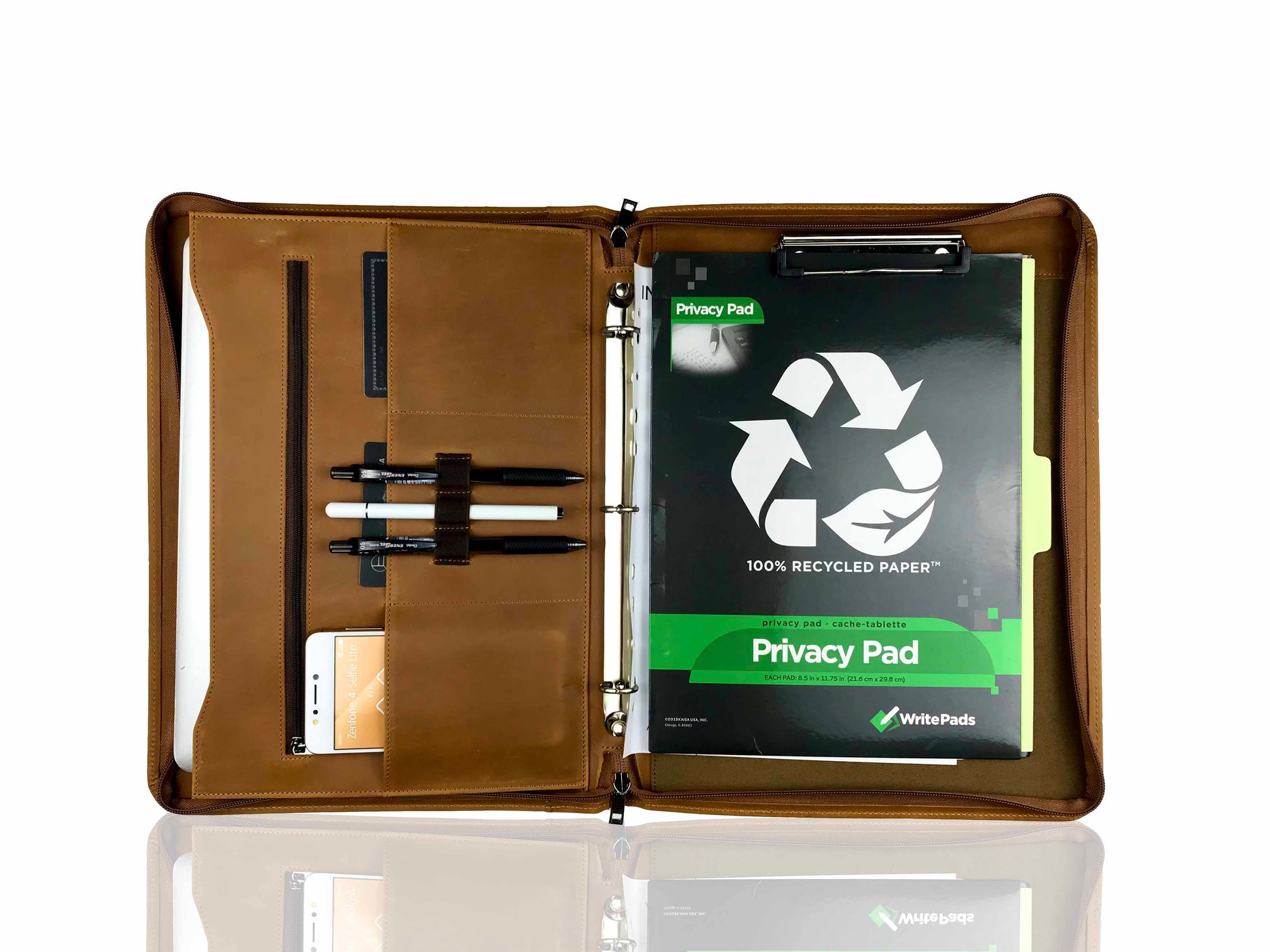 - √ Versatility: 3 small pockets for notebook/ cards/ phone; 3 pen holder; 1 zipper pocket; 1 large pocket for MacBook 13"; 1 3-ring binder can store up to 60 sheets of paper; 1 clipboard for A4/ letter size notepad / writhing pad/ legal paper 8.5" x 11"/ 8.5" x 14"