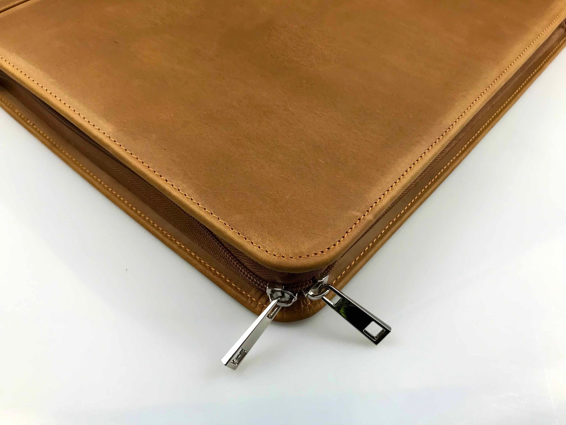 - √ Premium Genuine Leather: The tan colour leather portfolio is made of top quality crazy horse leather, a type of retro-looking genuine leather, retaining the original leather colour to the greatest extent, the texture becomes more and more delicate the longer it's used.