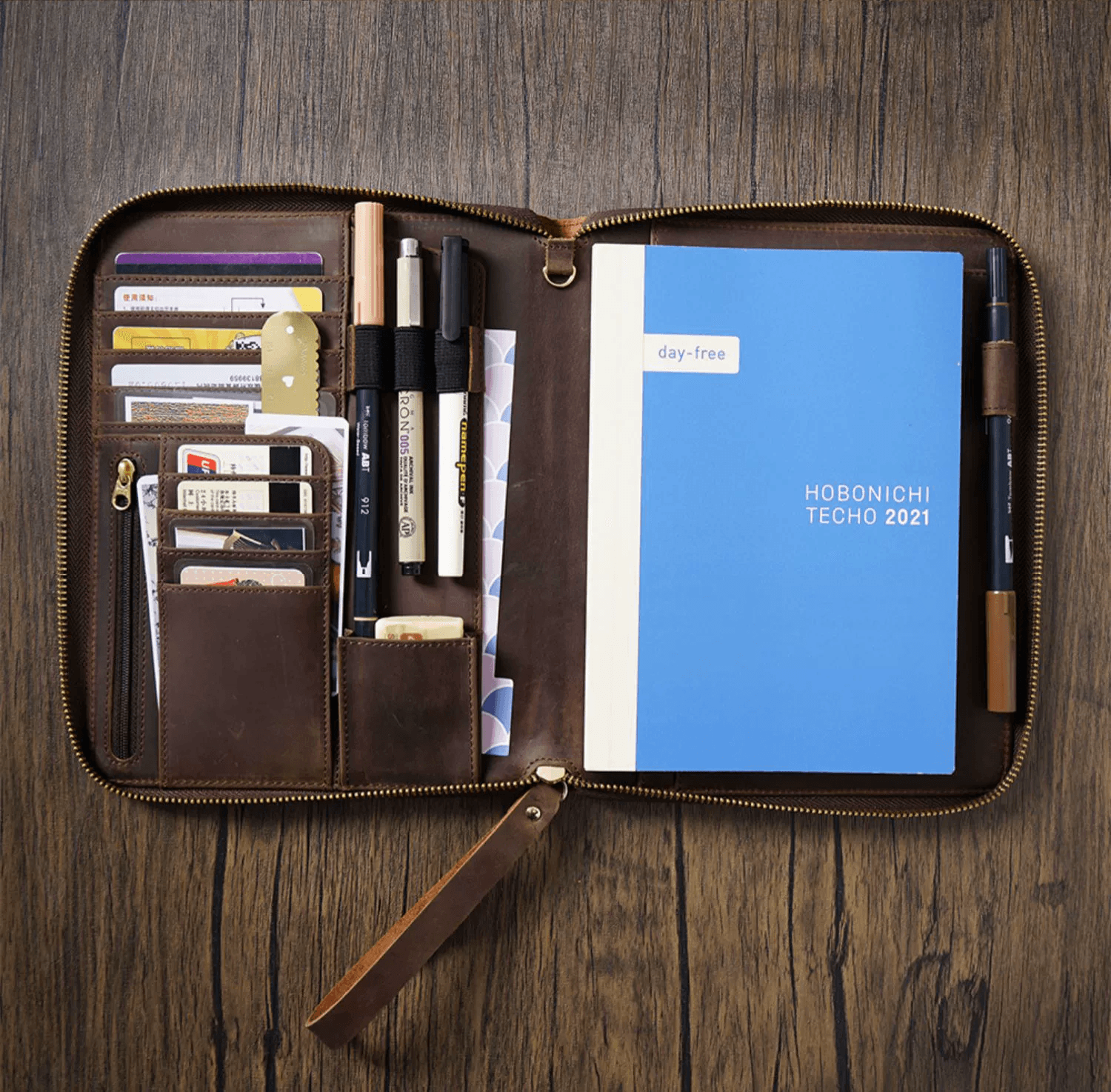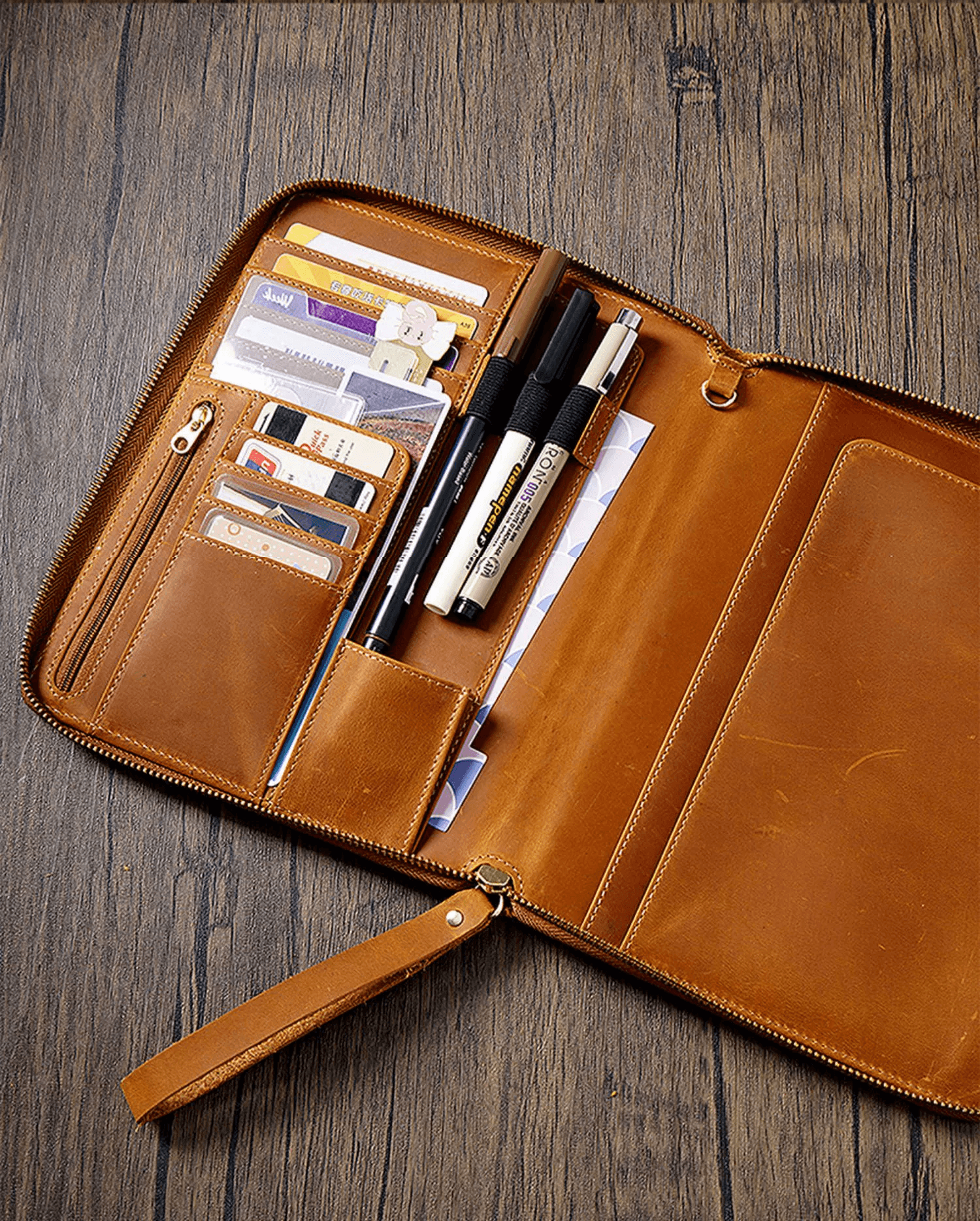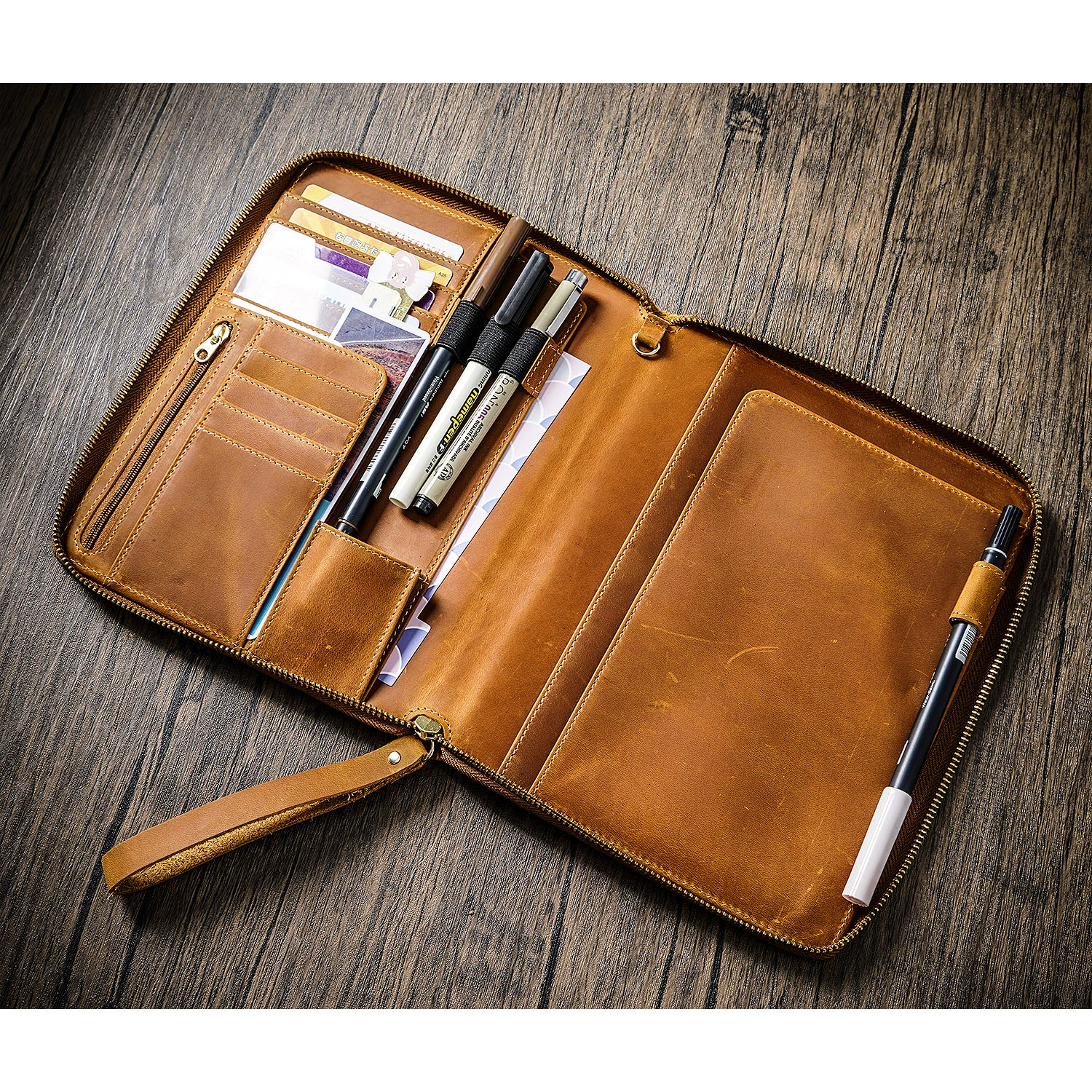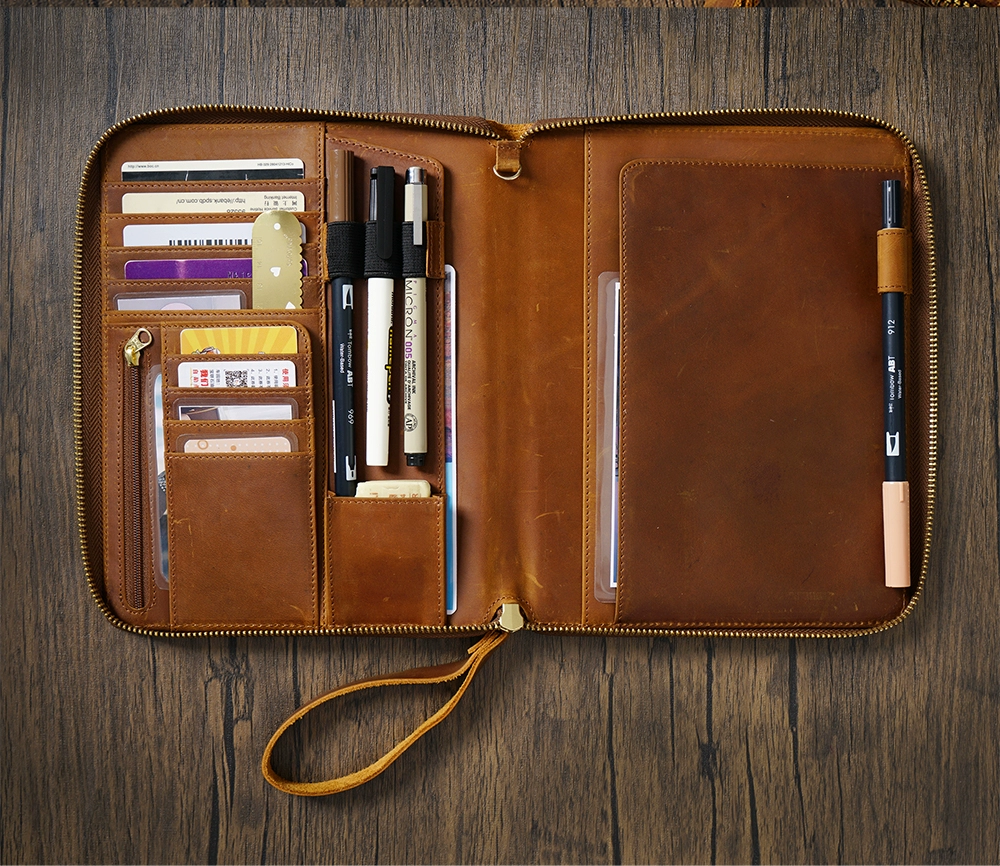- √ Versatility: 4 horizontal card slots; 4 vertical card slots; 1 small pocket; 1 side pocket for smartphone; 1 zipper pocket; 1 secretarial pocket; 2 large side pockets; 3 pen holders; 1 large secretarial pocket; 1 leather pen loop;