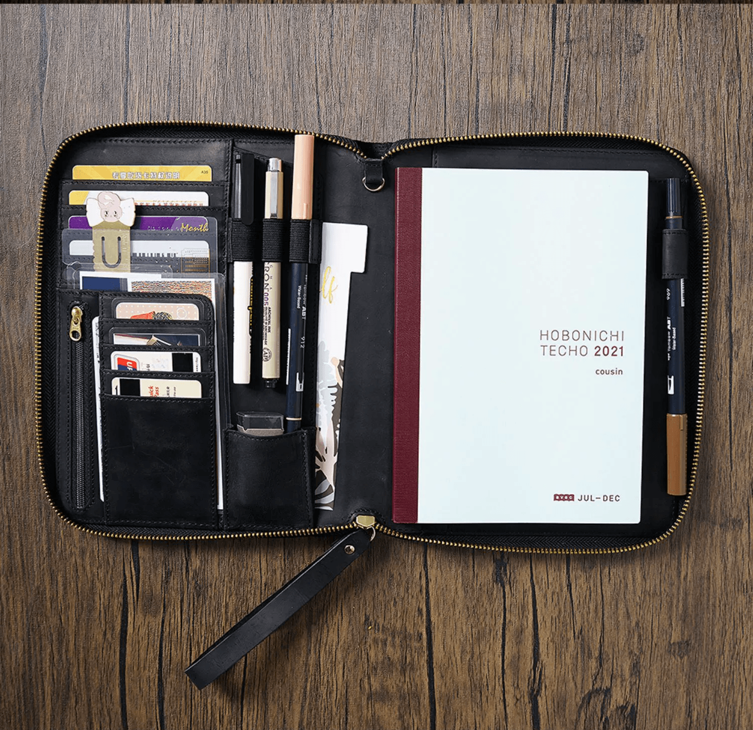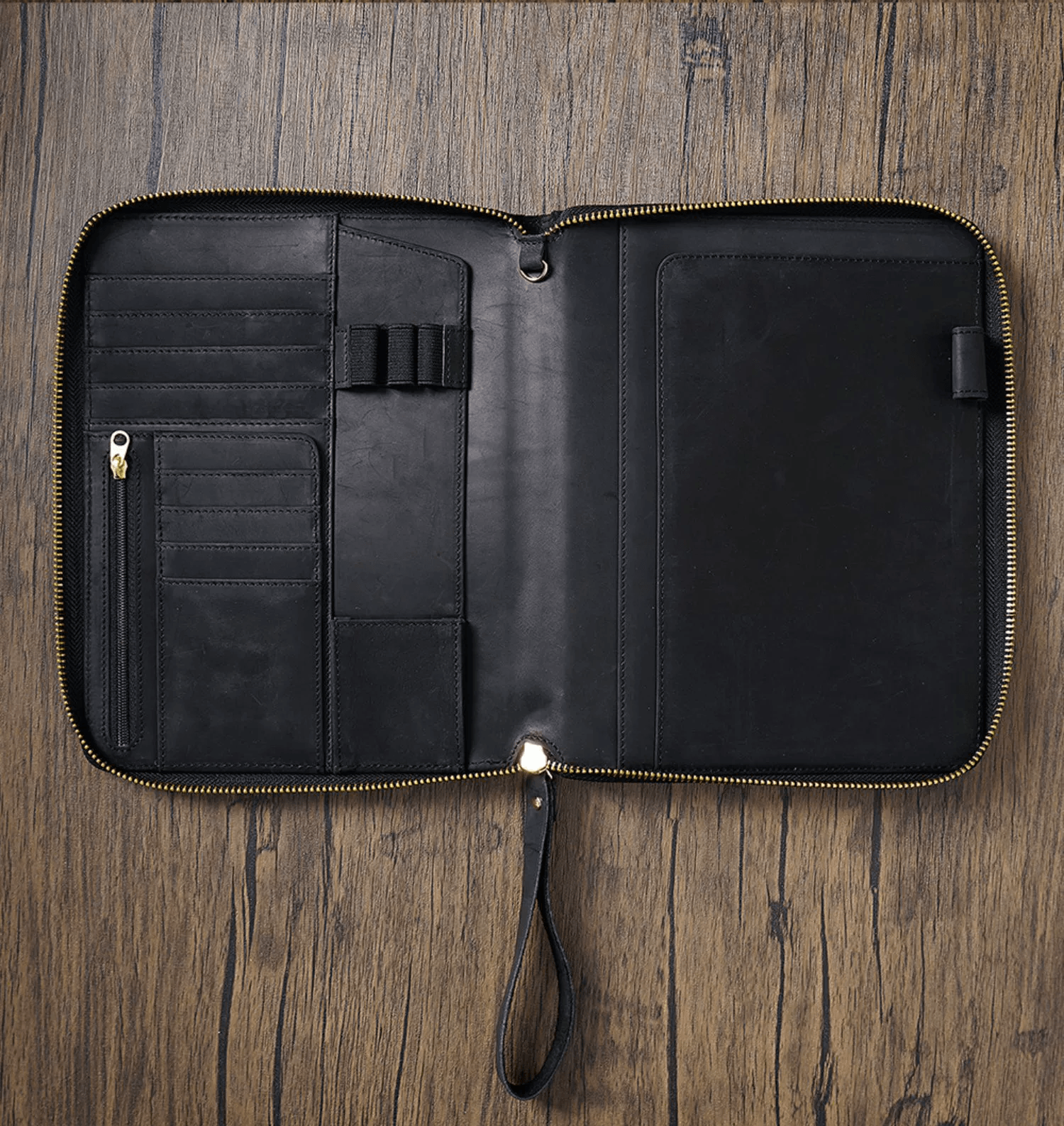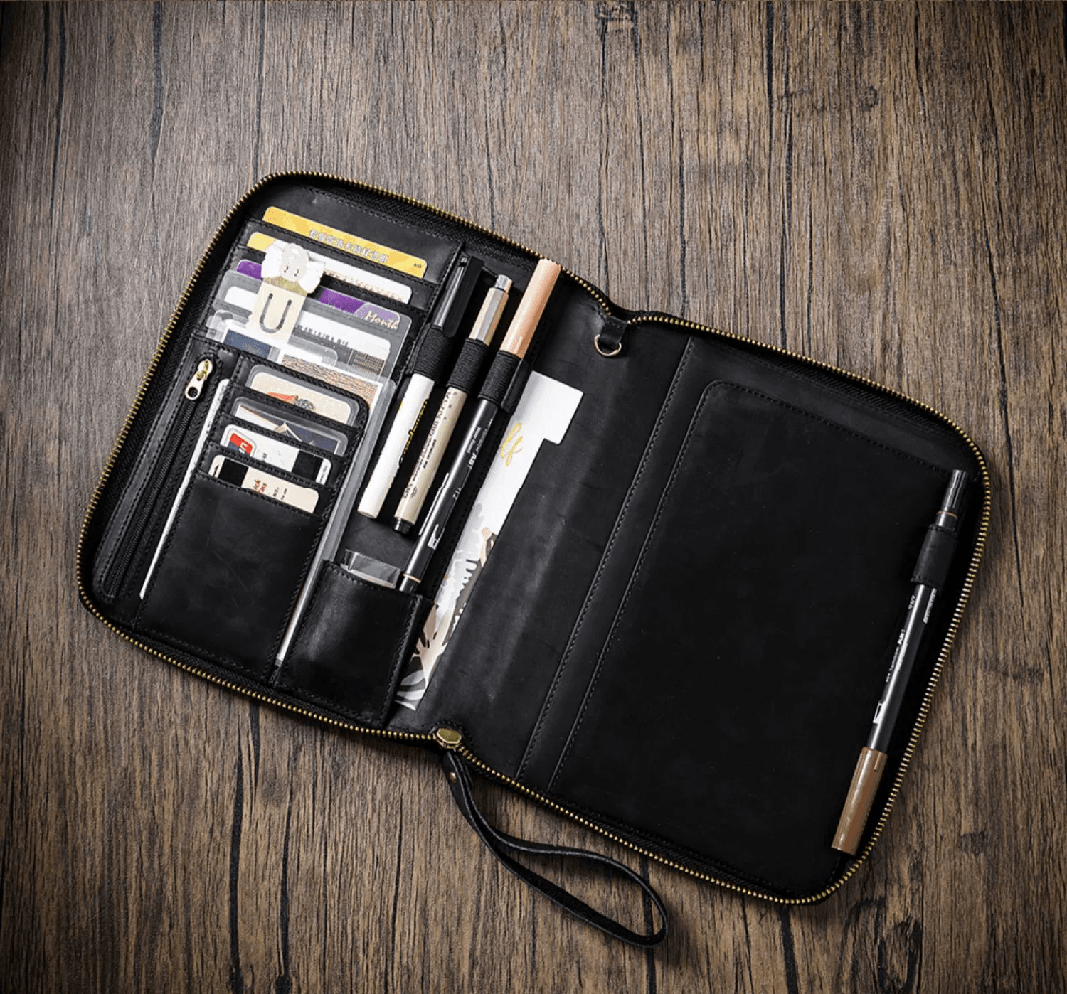 - √ Versatility: 4 horizontal card slots; 4 vertical card slots; 1 small pocket; 1 side pocket for smartphone; 1 zipper pocket; 1 secretarial pocket; 2 large side pockets; 3 pen holders; 1 large secretarial pocket; 1 leather pen loop;