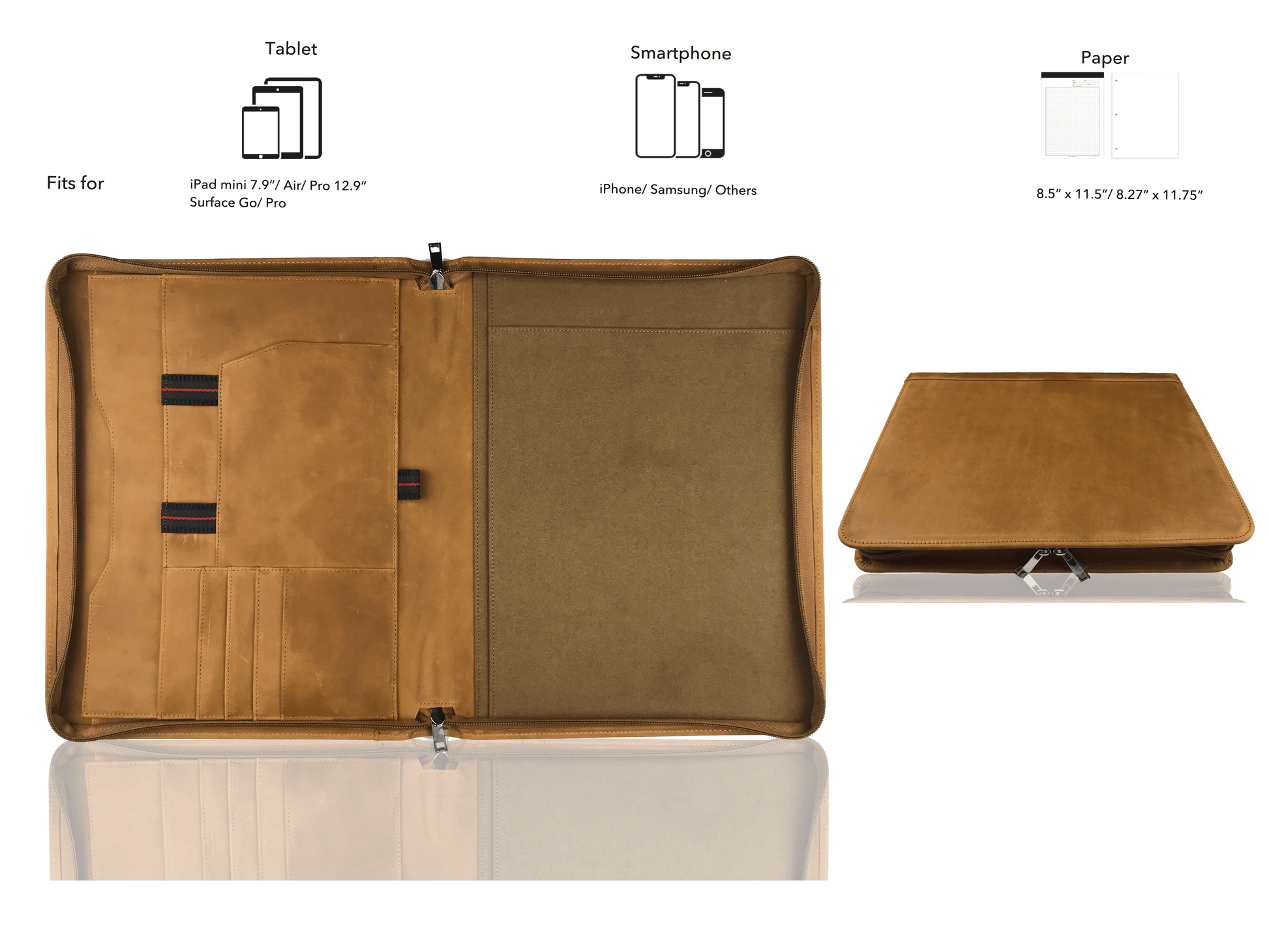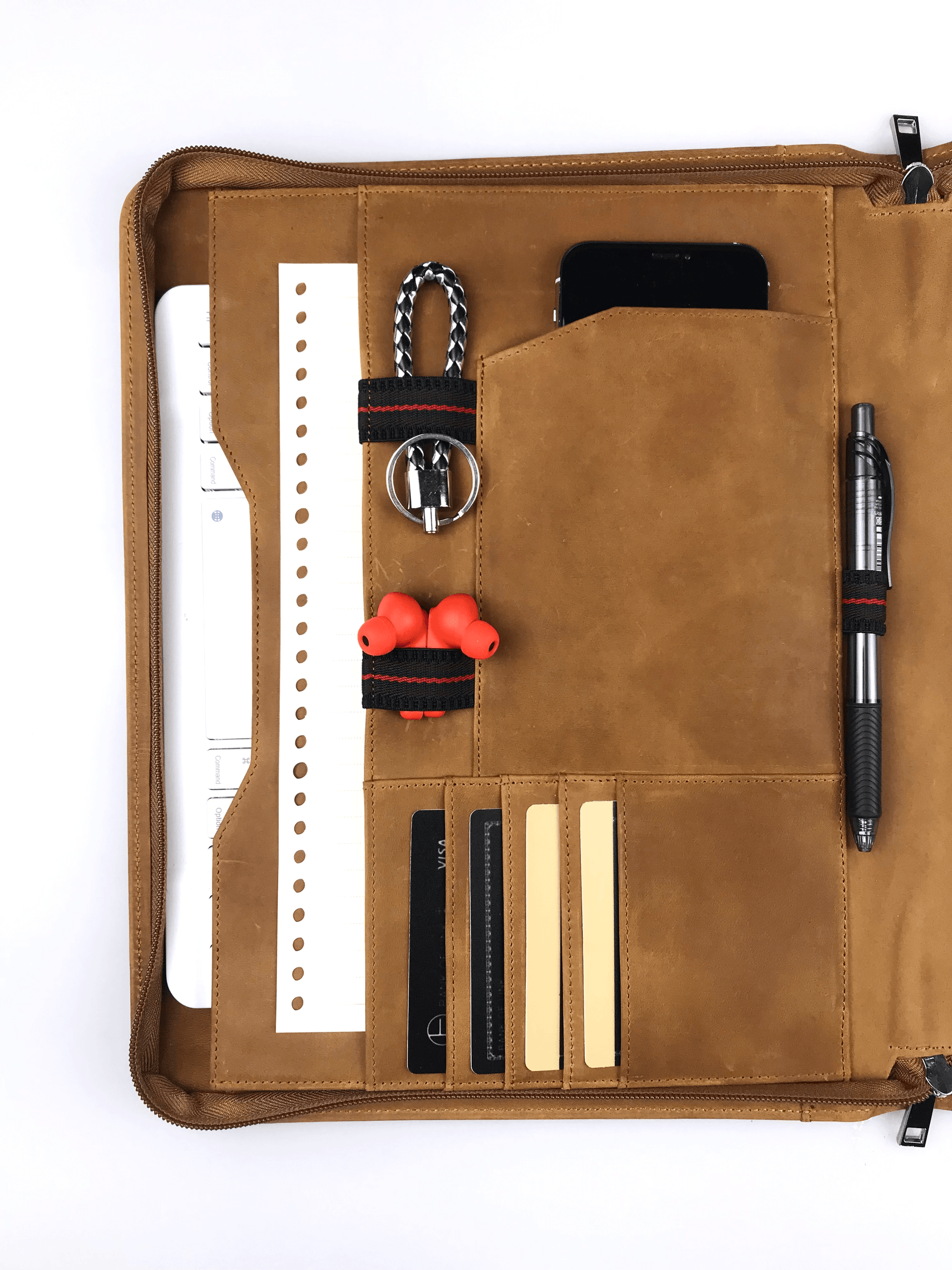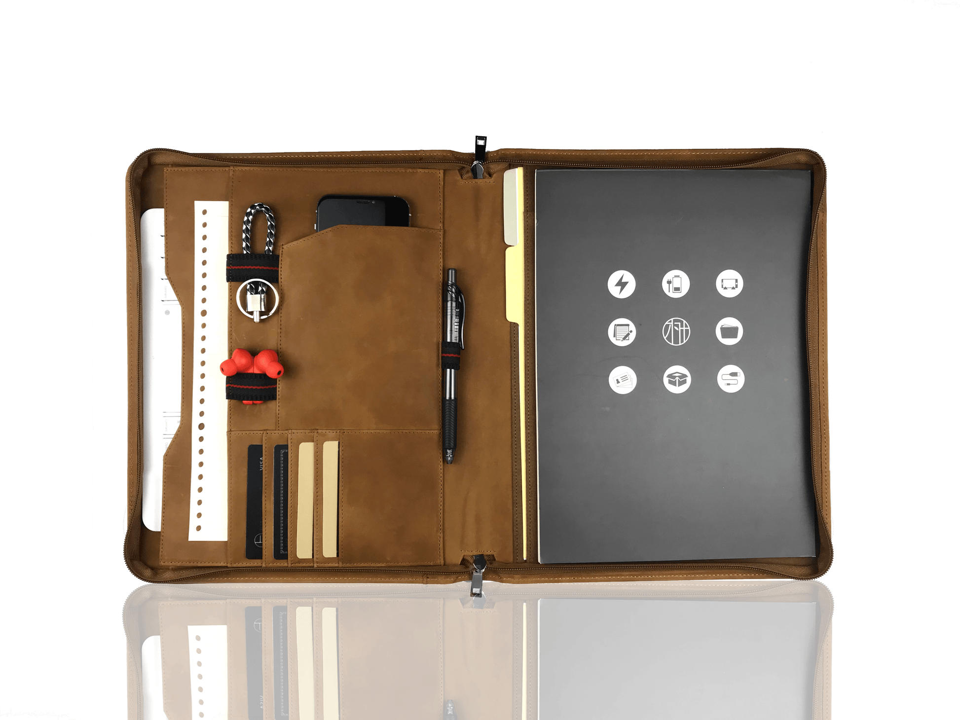 - √ Versatility: 1 pocket for A4/ legal paper; 1 side pocket for A4/ legal paper; 1 pocket for iPad Pro 12.9; 4 card slots; 1 pen holder; 1 phone holder; 1 earphone holder + 1 cable holder