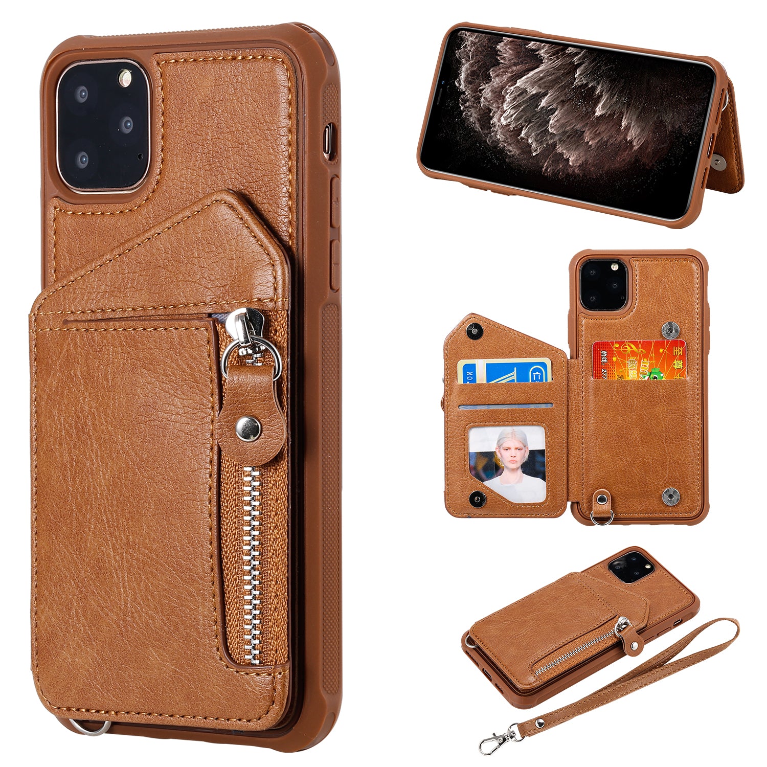- Strap iPhone case with 3 card slots and 1 foldable zipper pocket, fine workmanship, stylish.